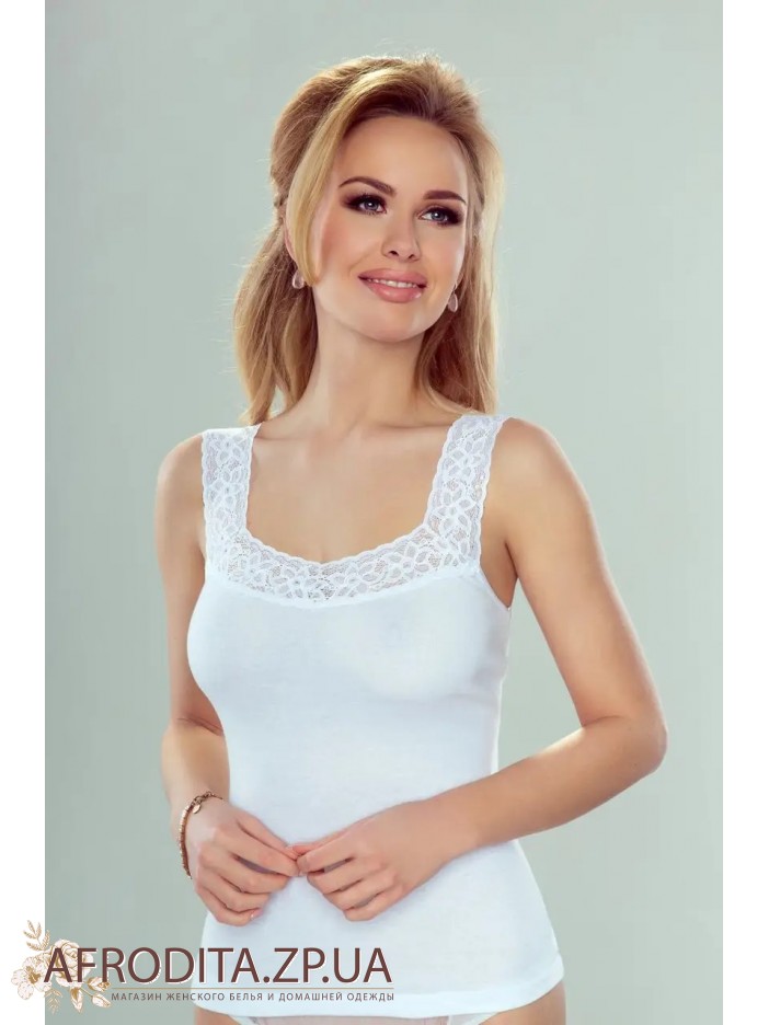 Майка жіноча Arietta на широких бретелях від польського бренду Eldar. Майка виготовлена з трикотажної тканини на основі бавовни, модель приталеного силуету. Бретели виготовлені з мереживного полотна, область декольте також прикрашена мереживом кольору виробу. Модель дуже практична, тканина м'яка та приємна до тіла. Модель чудово підходить для повсякденного користування.
