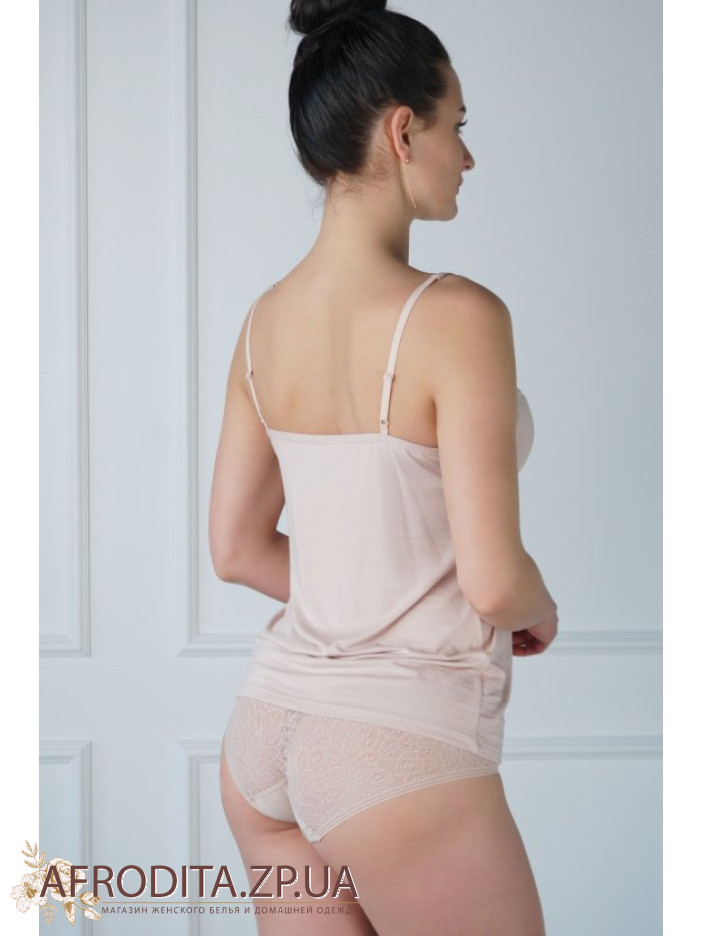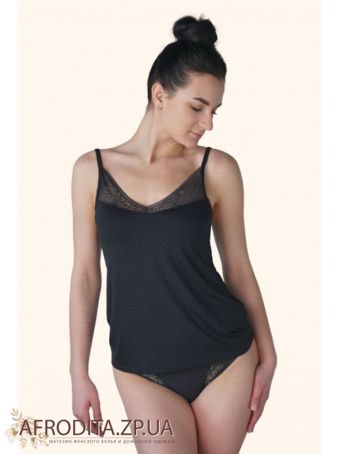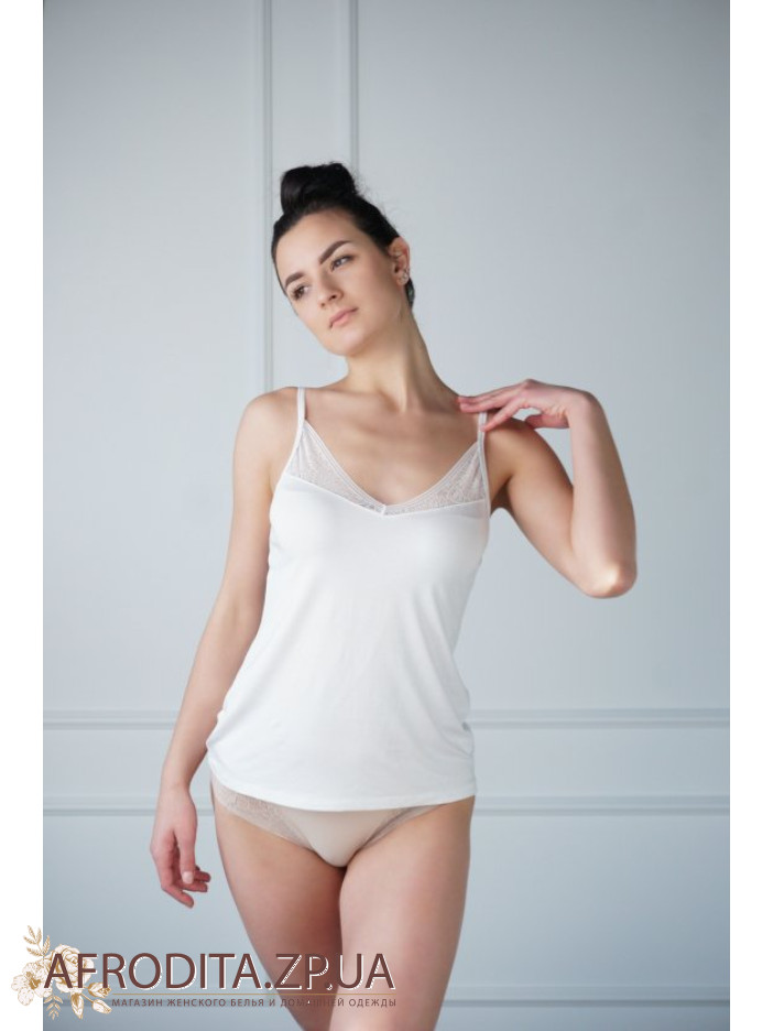 Легка ніжна майка від іспанського бренду JANIRA. Трикутне декольте прикрашене елегантним мереживом з квітковим мотивом, тонким і плоским, що дозволяє носити її навіть під легкі тканини одягу.