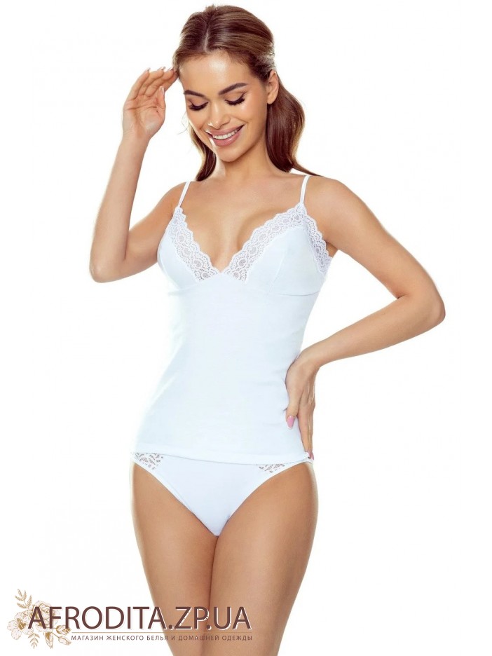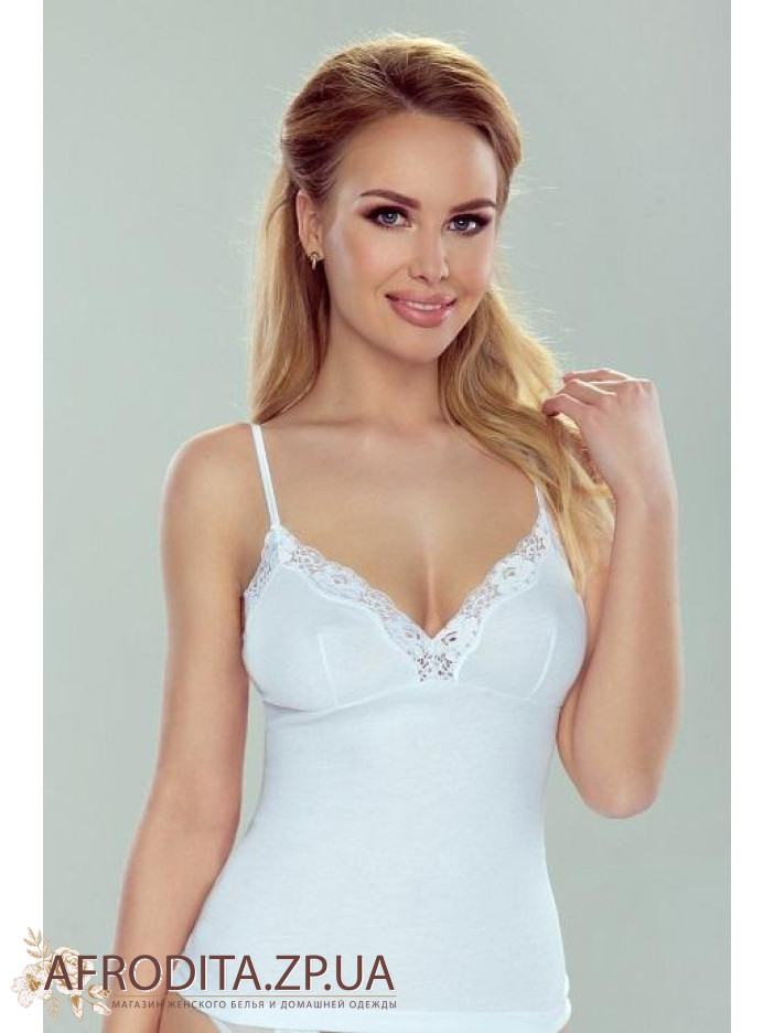 Майка жіноча на тонких регулюємих бретелях Adela з м'якого і приємного до тіла трикотажу на основі бавовни від польської торгової марки ELDAR. Модель приталеного крою, область декольте декорована мереживом кольору виробу. Майка виглядає дуже лаконічно і стильно і може бути відмінним подарунком близькій вам людині.