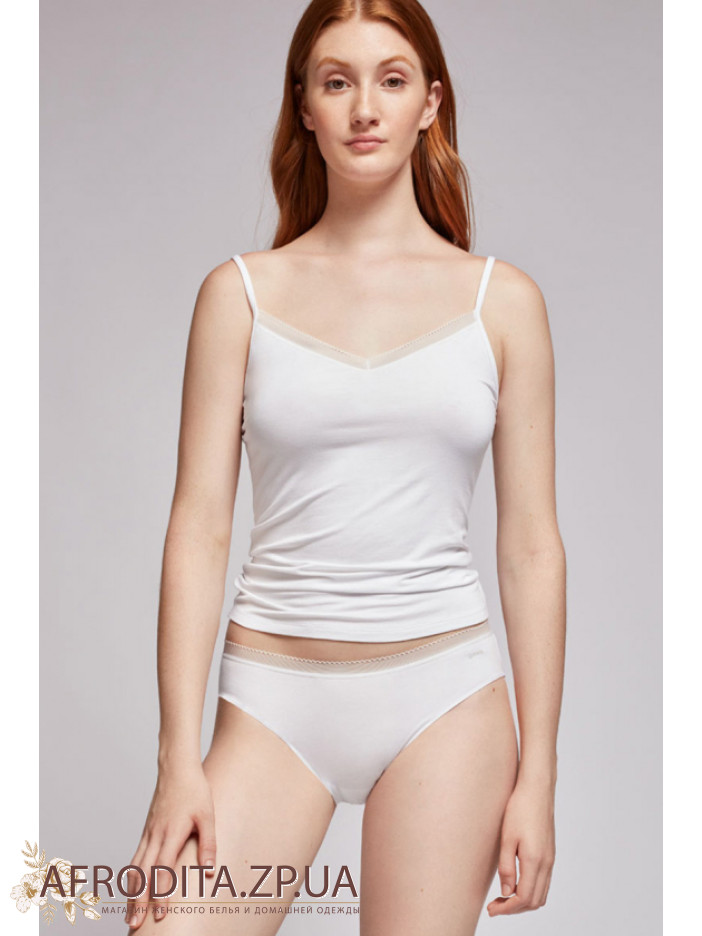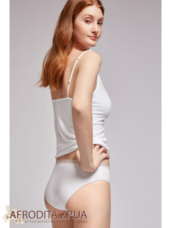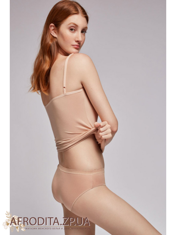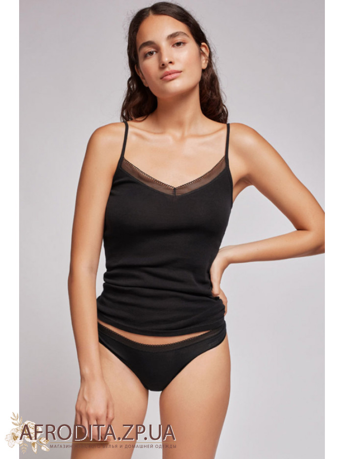 Майка від іспанського бренду Gisela. Тканина дуже легка, шовковиста та м'яка за рахунок великого вмісту модалу у складі. Виріз декольте декорований тонкою напівпрозорою еластичною тасьмою. Бретелі регулюються по довжині.