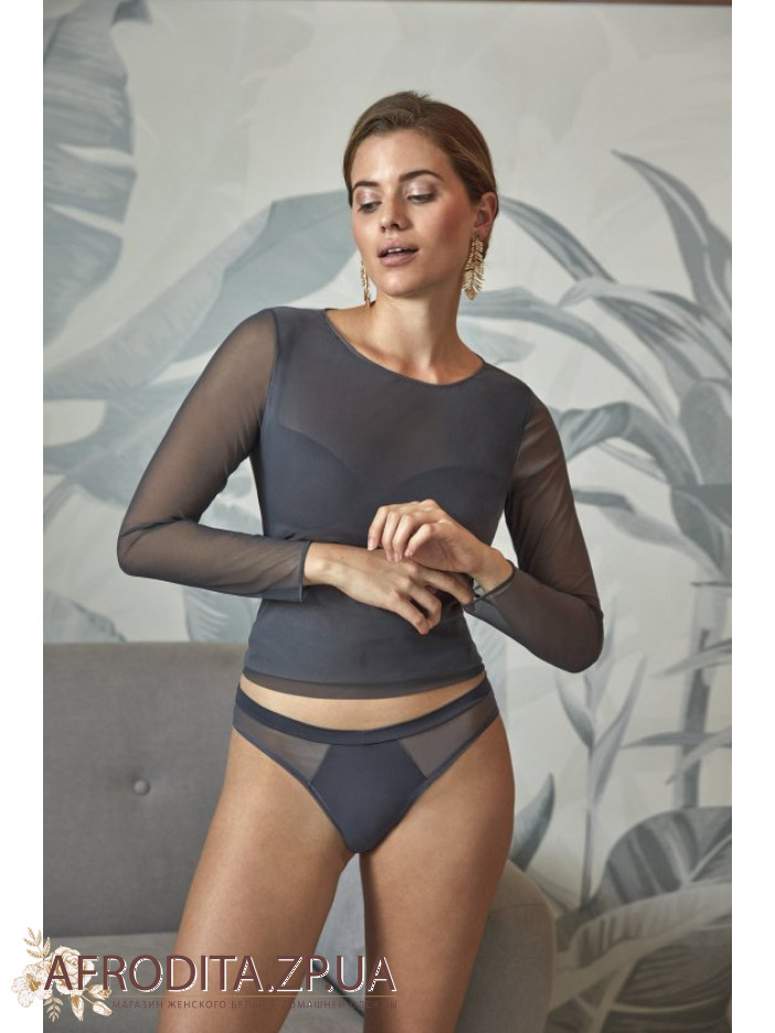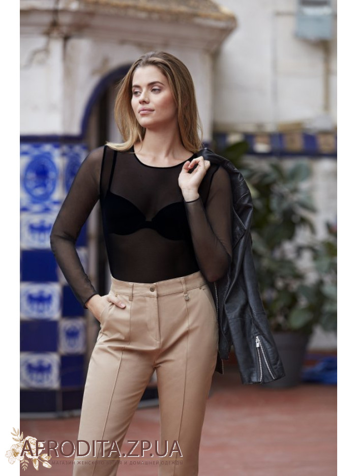 Жіночий лонгслів в мінімалістичному стилі виконаний з високоякісного еластичного та м'якого тюля. Чуттєве поєднання напівпрозорого переду з прозорими руками та спинкою, що є трендом цього сезону.