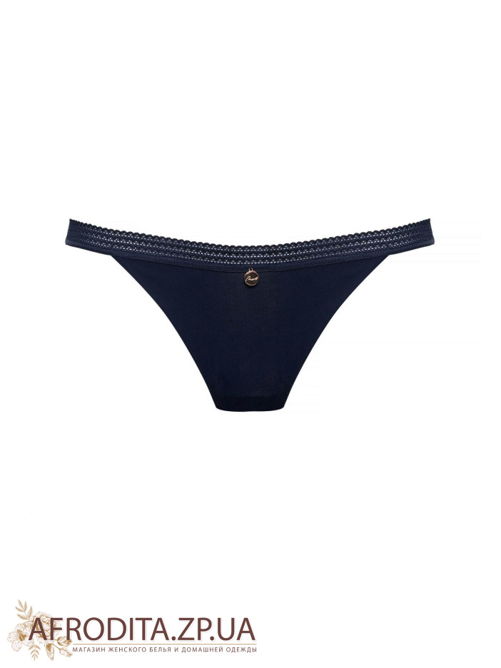Труси-танга з заниженою лінією талії. Передня деталь з мікрофібри, задня з еластичної подвійний сітки. Сторону у вигляді вузьких смужок. Краї окантовані еластичною тасьмою. Декор - медальйон з логотипом Marc & Andre. Колір синій.