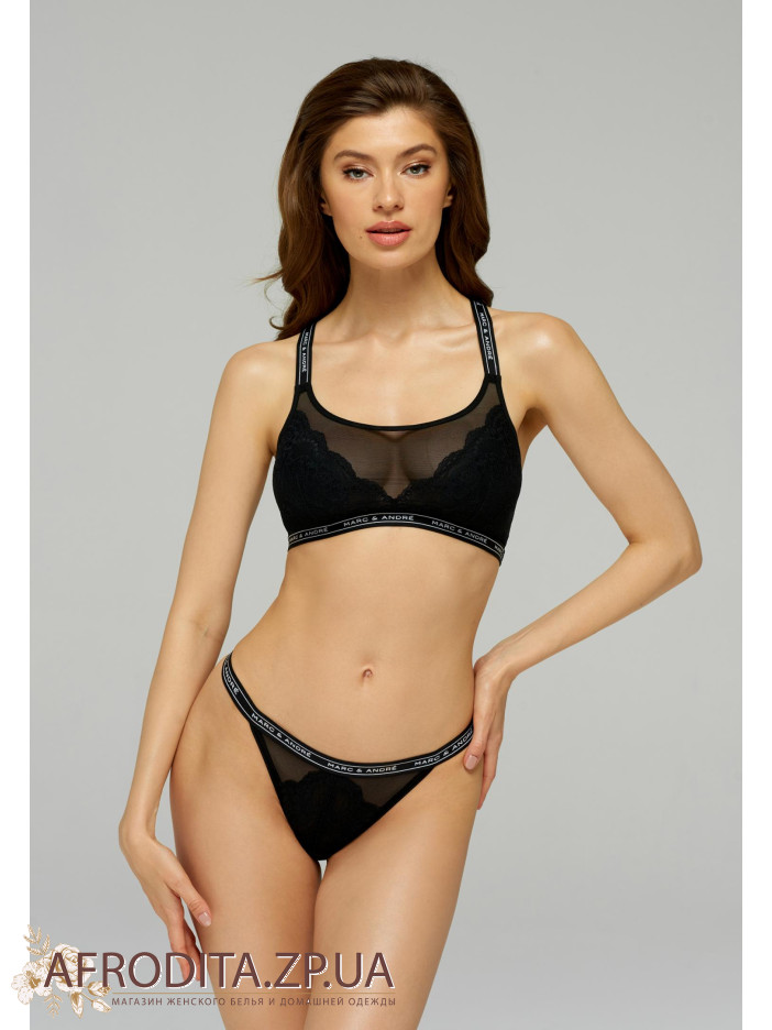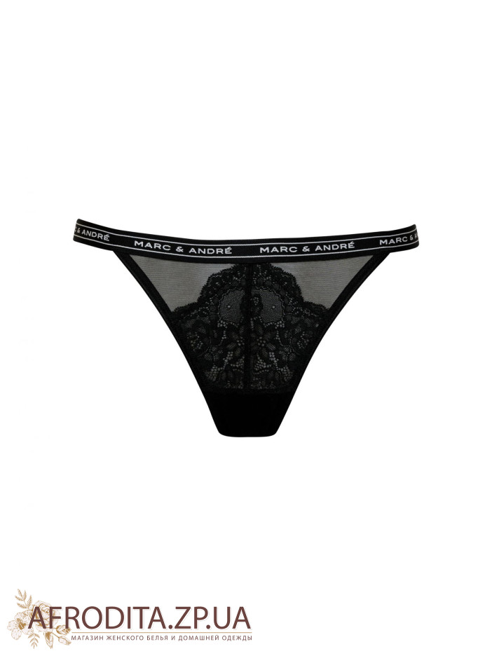Труси-стрінги із заниженою лінією талії. Передня деталь із мережива у поєднанні з сіткою. Задня роблять із мікрофібри на підкладці. Пояс виконаний із еластичної тасьми з написом Marc&Andre.