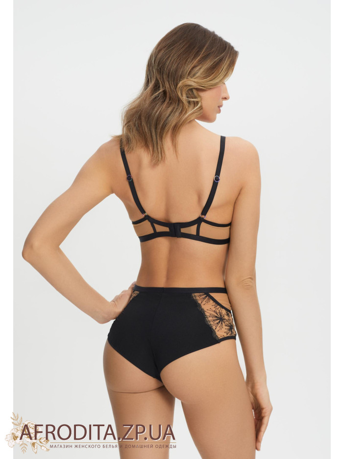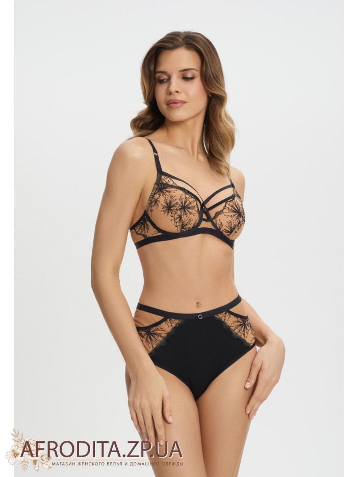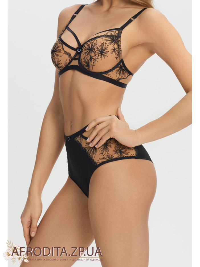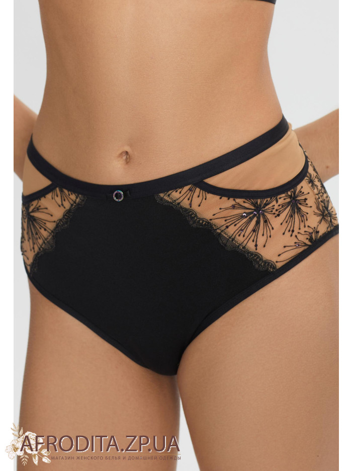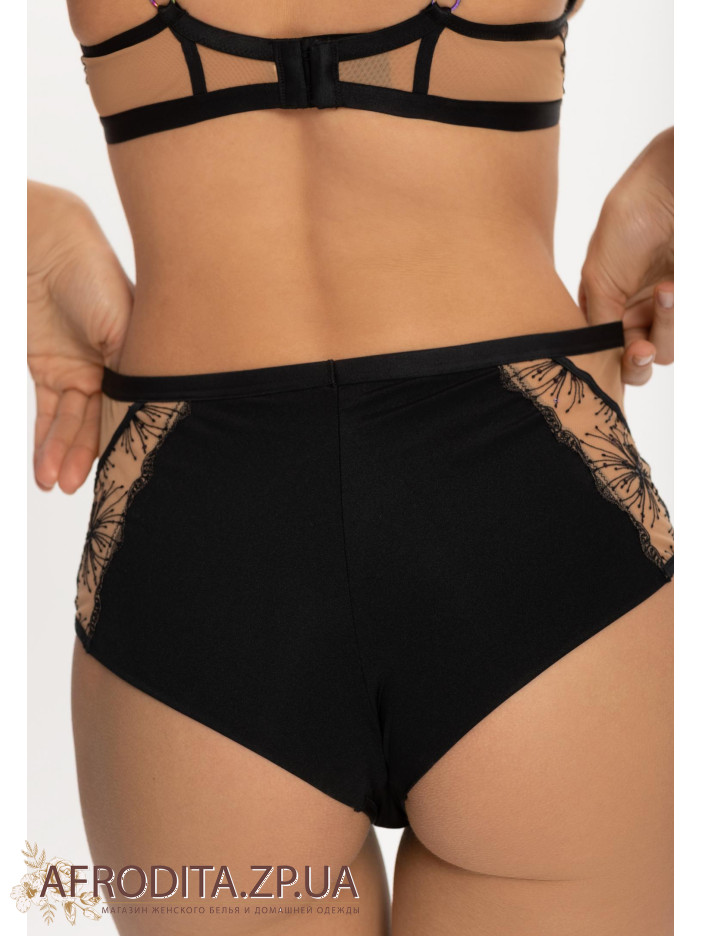 Труси-бразиліана з високою посадкою. Передня деталь з мікрофібри та вишивки на сітці. Задня деталь з подвійної мікрофібри в підворіт, без шва по нижньому краю.