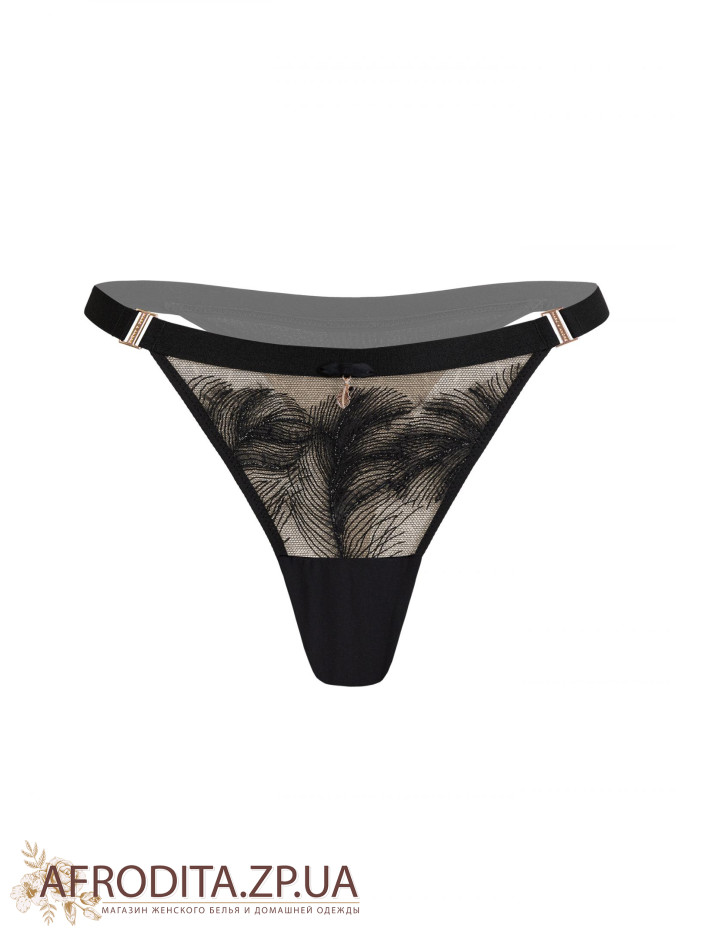 Стрінги із заниженою посадкою. Передня деталь – сітка з невагомою вишивкою з пір'їнками. Задня деталь – гладка мікрофібра. Пояс з еластичної тасьми прикрашений мініатюрними аксесуарами, завершуючи вишуканий образ.