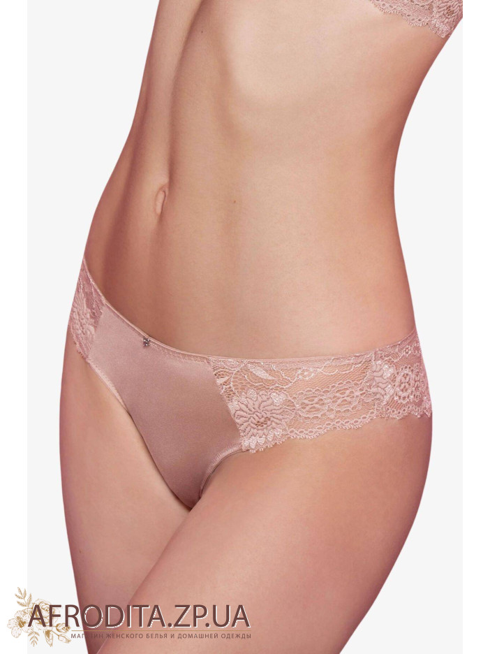Труси бразилиана з середньою лінією талії. Виконано з еластичної м'якої мікрофібри з ефектом блиску і мережива з рослинним орнаментом плетіння.