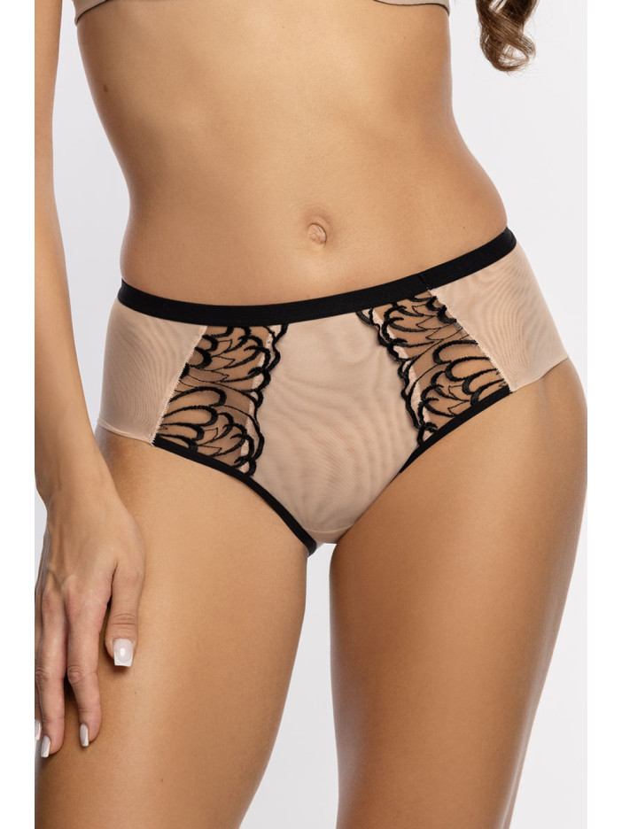 Трусики від латвійського бренду ORHIDEJA – стильна та комфортна модель, що підкреслює жіночні форми. Виготовлені з тілесного подвійного тюлю та прикрашені вишуканою чорною вишивкою, вони створюють елегантний та спокусливий образ. Широкі боковинки красиво акцентують округлість стегон, а м'яка гумка у талії забезпечує надійну, але комфортну фіксацію. Безшовна спинка з вертикальним швом гарантує ідеальну посадку і акуратний силует, а бавовняна ластка додає зручність і гігієнічність, роблячи ці трусики ідеальними для повсякденного носіння та особливих випадків.