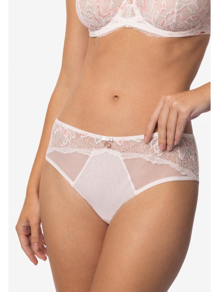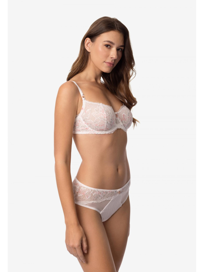 Серія ADORE – втілення чистої гармонії та витонченої жіночності. Натуральний білосніжний відтінок мережива з витонченими ажурними краями стає ідеальним фоном для тонких колірних акцентів. Палітра серії – жива, радісна і водночас збалансована, наповнює образ свіжістю та легкістю. Труси-бразиліана із середньою лінією талії – це гармонійне поєднання комфорту і чуттєвості. Передня частина виконана з гладкої мікрофібри, прозорої сіточки і витонченого мережива, створюючи гармонійну гру фактур. Задня деталь повністю виконана з мережива з ажурними краями, яке м'яко підкреслює лінії силуету і надає образу витончену спокусливість. ADORE — це витонченість, легкість і бездоганний баланс комфорту і краси.
