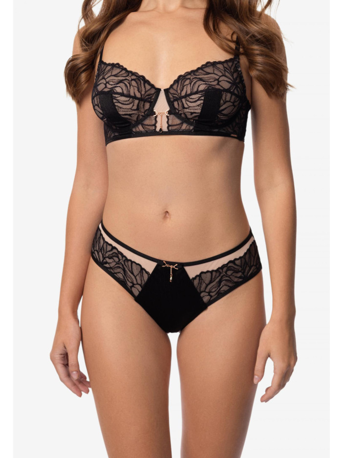 У серії LE MYSTÈRE ми поєднали м'якість і силу, ніжність і контраст. Чорне мереживо поєднується з нюдовою сіткою, а графічні канти з мікрофібри додають чіткості, зберігаючи легкість і делікатність. LE MYSTÈRE — для тих, хто цінує баланс і сміливість самовираження. Вишукані трусики-бразиліана з комфортною середньою лінією талії створюють гармонійний і жіночний силует. Еластичний пояс ніжно облягає фігуру, забезпечуючи ідеальну посадку. Передня частина поєднує м'яку мікрофібру, напівпрозору сітку і вишукане мереживо, додаючи моделі витонченості і сексуальності. Задня деталь виконана з мережива з ажурними краями.