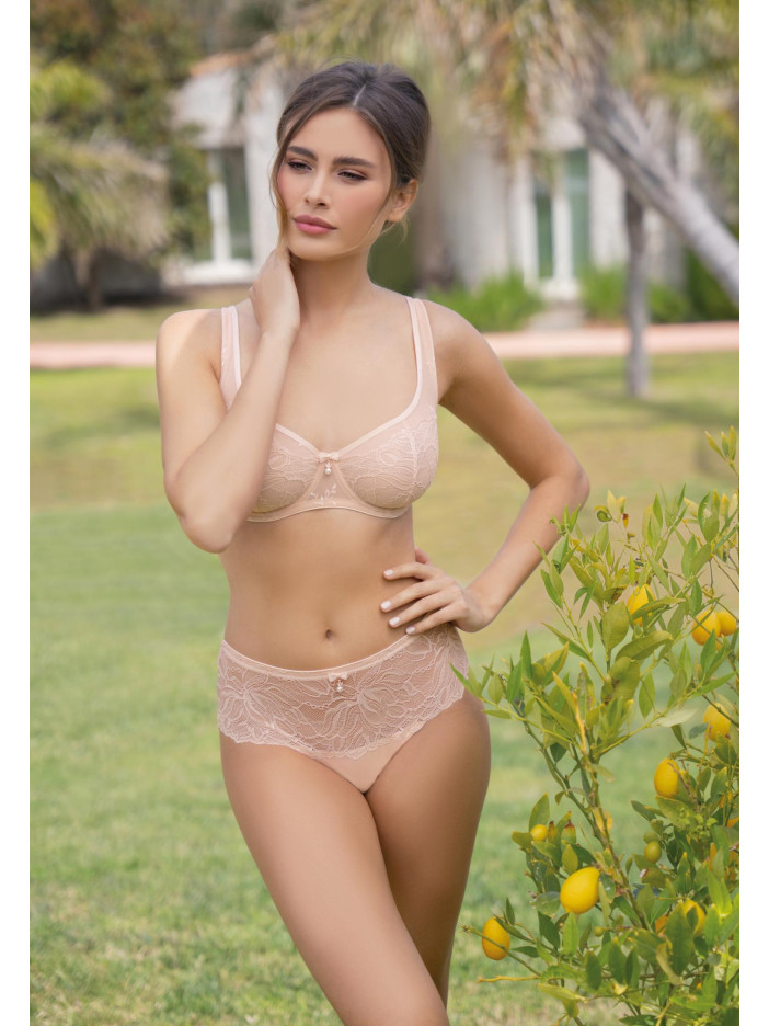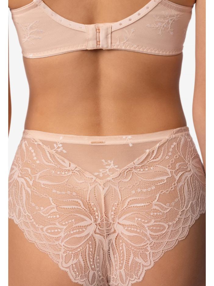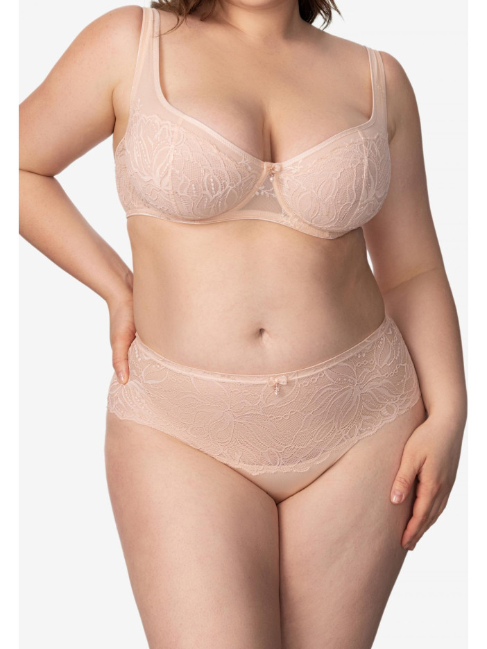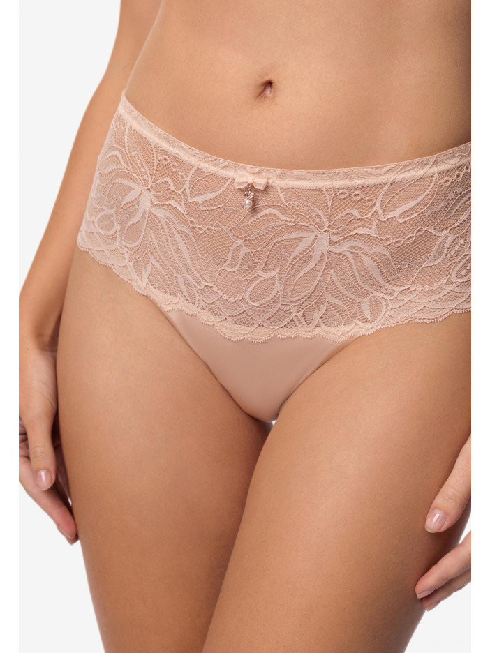 ESSENCE — це чуттєве втілення літа: легке, тепле і надихаюче. В основі серії — м'який нюдовий відтінок, що дарує відчуття спокою і затишку. Його відтіняють золоті і перлинні акценти, наповнені сяйвом і оптимізмом. Ця гармонія кольорів відображає настрій літа — коли день яскравий, а ніч ніжна. Мереживні хіпстери із середньою посадкою. Декоративний пояс з еластичної тасьми прикрашений аксесуаром — перлиною. Передня і задня деталь з мережива з ажурними краями.