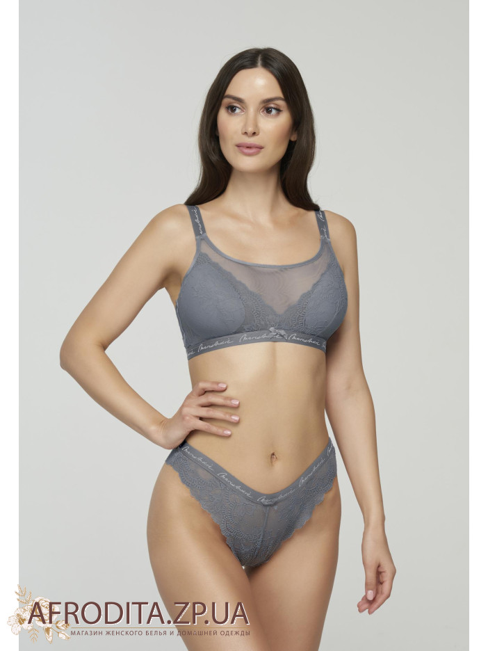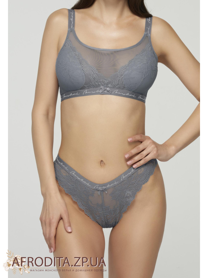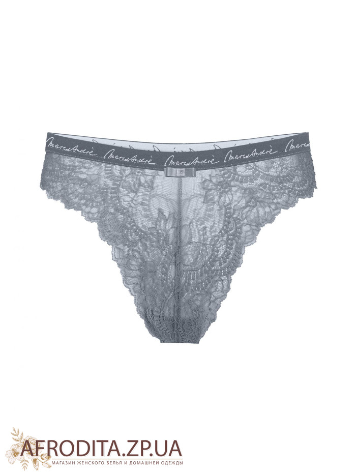 Труси-стрінги S23-0591-STO-LZ із середньою лінією талії. Передня і задня деталі з мережива. Завищений виріз по лінії бікіні. Пояс з еластичної тасьми з написом Marc & André.