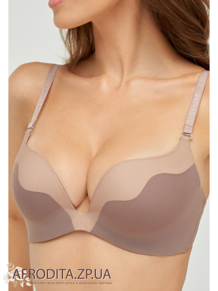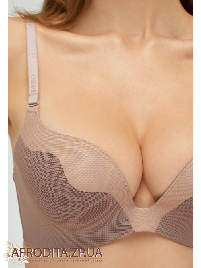 Бесшовный бюстгальтер с формованной чашкой и встроенным «Super push-up» на каркасной поддержке. Боковые детали с поддерживающими косточками. Съемные бретели. Задняя часть выполнена из двойной эластичной сетки. Предлагаются трусики брифы – бразилиана со средней линией талии. Более открытая модель, чем традиционные трусики. Задняя часть имеет вертикальный шов, что обеспечивает максимально комфортную посадку.