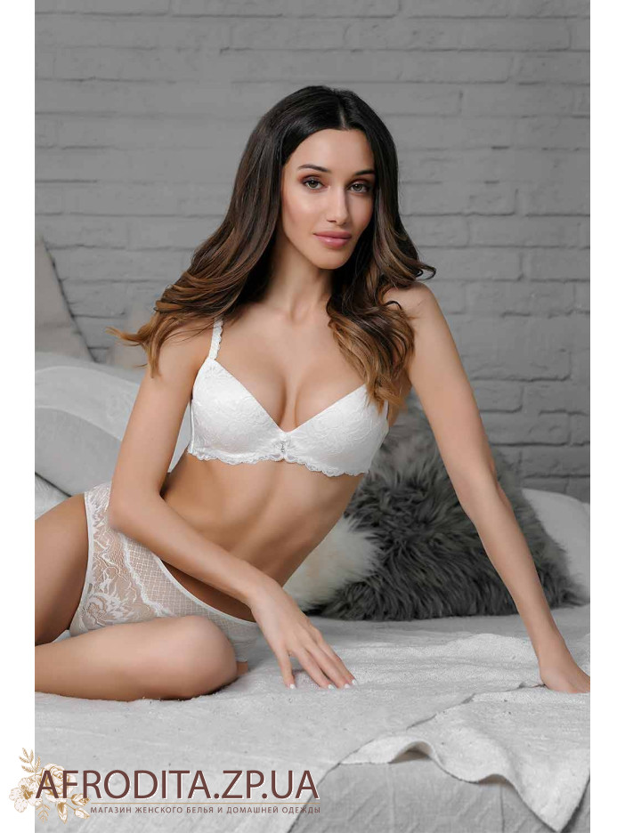 Бюстгальтер с уплотненными чашками на основе из тонкостенного поролона. Нагрузки на себя берут косточки и широко расставленные бретели. Конструкция бюстгальтера направлена в первую очередь на приподнимание груди и их демонстрацию. Застежка на два крючка и три позиции объема. Бретели несъемные. Бюстгальтер выполнен из красивого кружева и нежного тюля с узором.