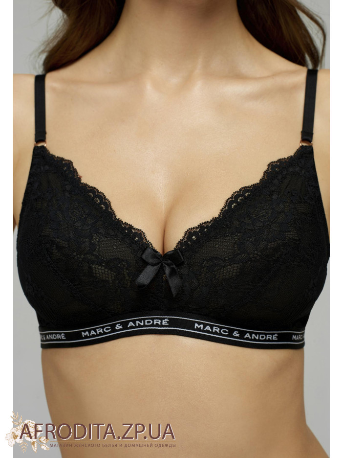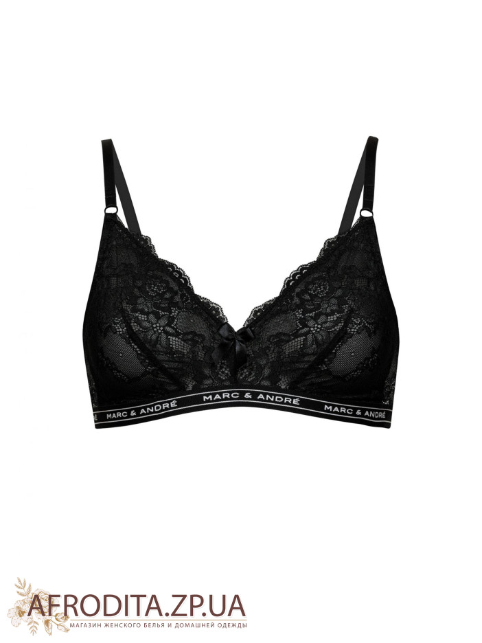Бескаркасный тонкий бюстгальтер "Bralette" дарит абсолютное ощущение комфорта и легкости. Мягкие чашки выполнены из эластичного кружева на подкладке из сетки. Кружевной стан. По нижнему краю эластичная тесьма с надписью Marc&Andre. Декор - сатиновый бантик.