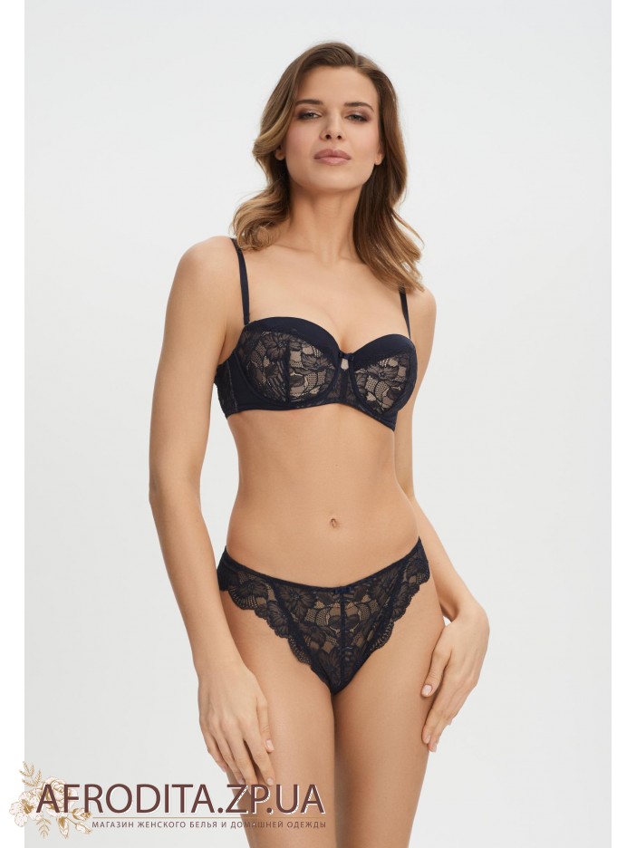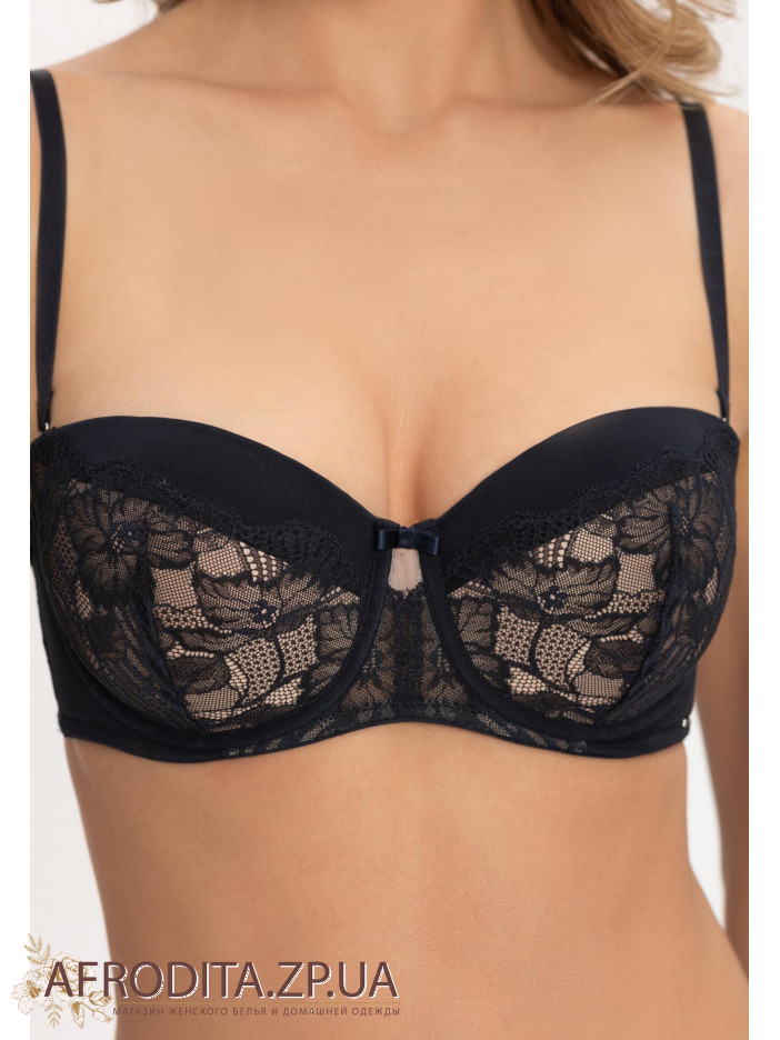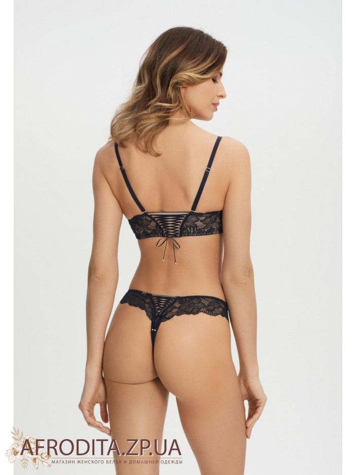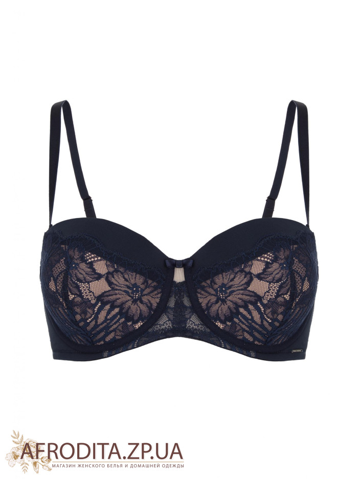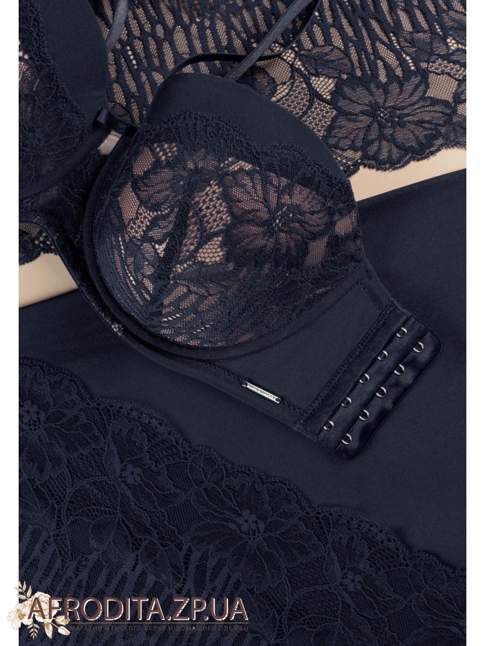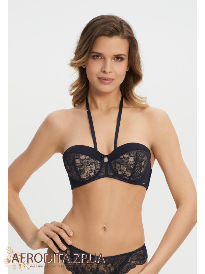 Бюстгальтер-балконет без косточек с формованной чашкой без пуш-ап. Пояс выполнен из кружева на подкладке из сетки. Необычная спинка с декоративной шнуровкой придает пикантность, застежка на крючках расположена сбоку. По верхнему краю бюстгальтера и нижнему краю пояса предусмотрена силиконовая лента, позволяющая носить бюстгальтер без бретелек. Запасные силиконовые бретели и дополнительный длинный халтер-бретель вокруг шеи идут в комплекте.