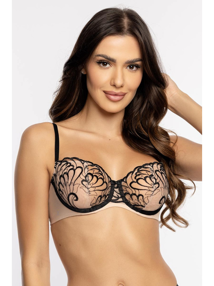 Бюстгальтер от латвийского бренда ORHIDEJA — утонченная модель, в которой чувственная прозрачность сочетается с продуманной поддержкой. Мягкие чашки на косточках выполнены из телесной микросетки и украшены изящной черной вышивкой, создающей эффект элегантного контраста на коже. Конструкция с I-швом деликатно приподнимает грудь, придает ей аккуратную овальную форму и красиво округляет в верхней части, формируя выразительное и гармоничное декольте. Пояс из плотной удвоенной сетки анатомической формы обеспечивает надежную фиксацию и комфортную посадку без ощущения давления. Застежка на спине на два крючка с тремя вариантами объема позволяет идеально подогнать модель по фигуре, а регулируемые бретели, которые не отстегиваются, гарантируют стабильную поддержку на протяжении всего дня.