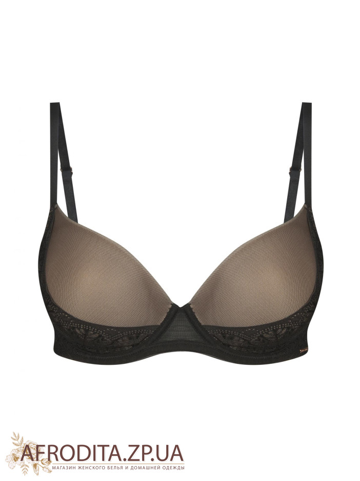 Бюстгальтер на каркасной поддержке с формованной чашкой и снимаемыми корректорами «пуш-ап». На боковой детали сделан перекресток из мягкого кружева и эластичной сетки.