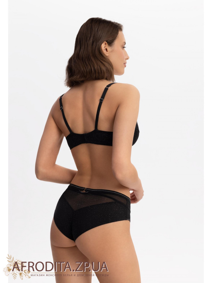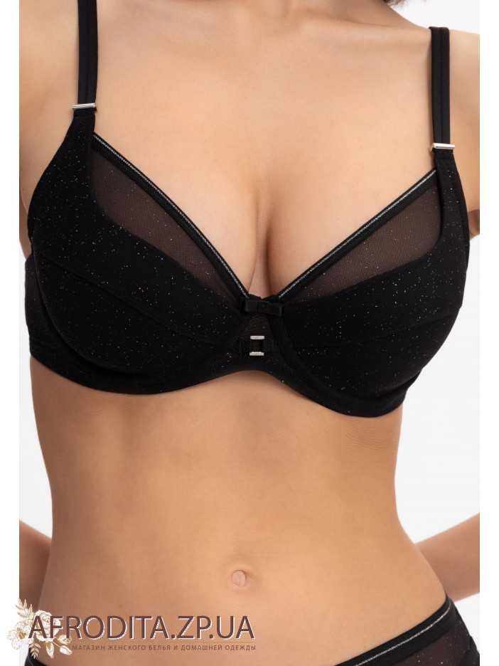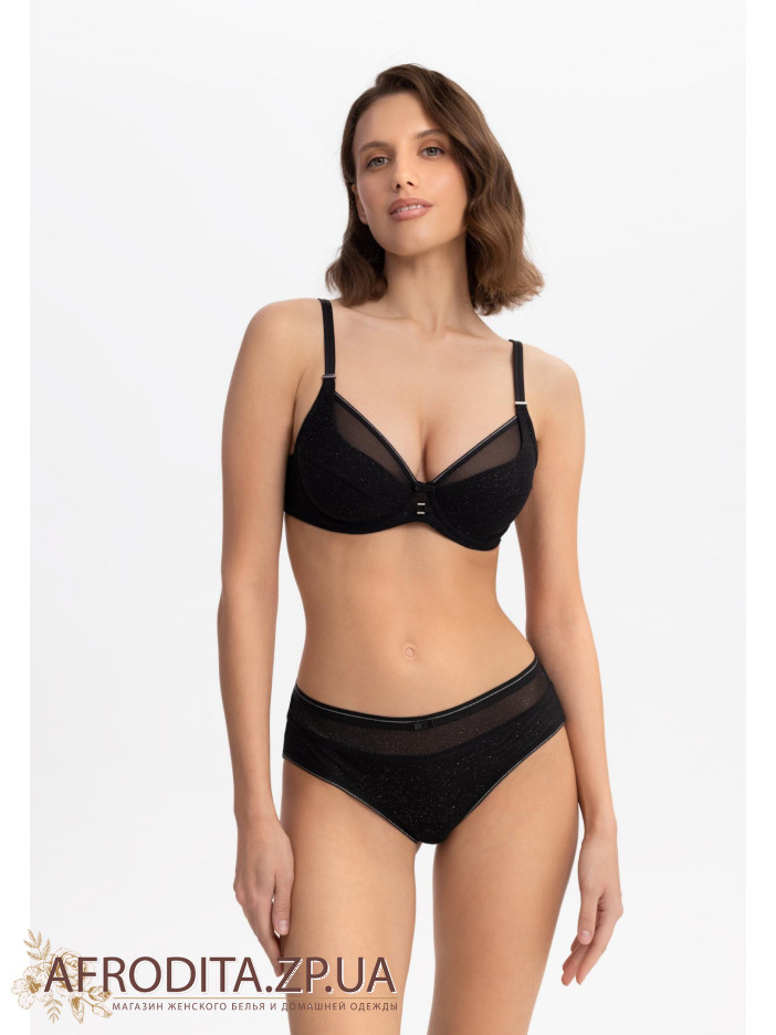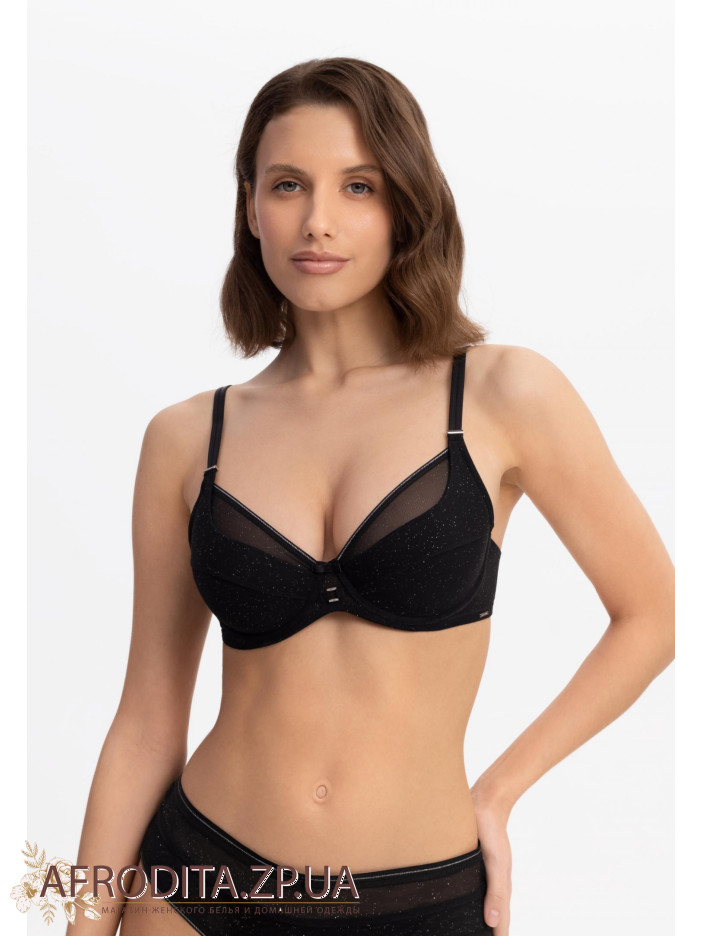 Бюстгальтер с полуапоролоновой чашкой на косточках, несет в себе нежность хлопка внутри и праздничное мерцание снаружи. Чашки декорированы эластичной сеткой с микроблестками. Чашки с внутренней стороны выполнены из хлопка. По линии декольте эластичная тесьма с серебристой нитью. Состояние из эластичной сетки с микроблестками на подкладке. Серия DEEP NIGHT – пусть звезды говорят за вас!