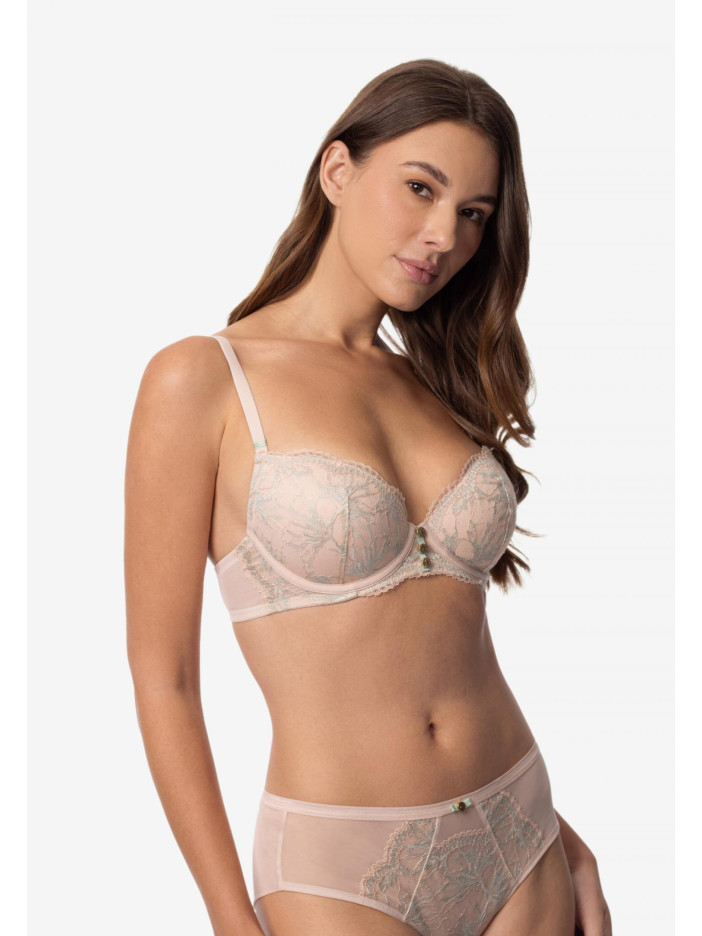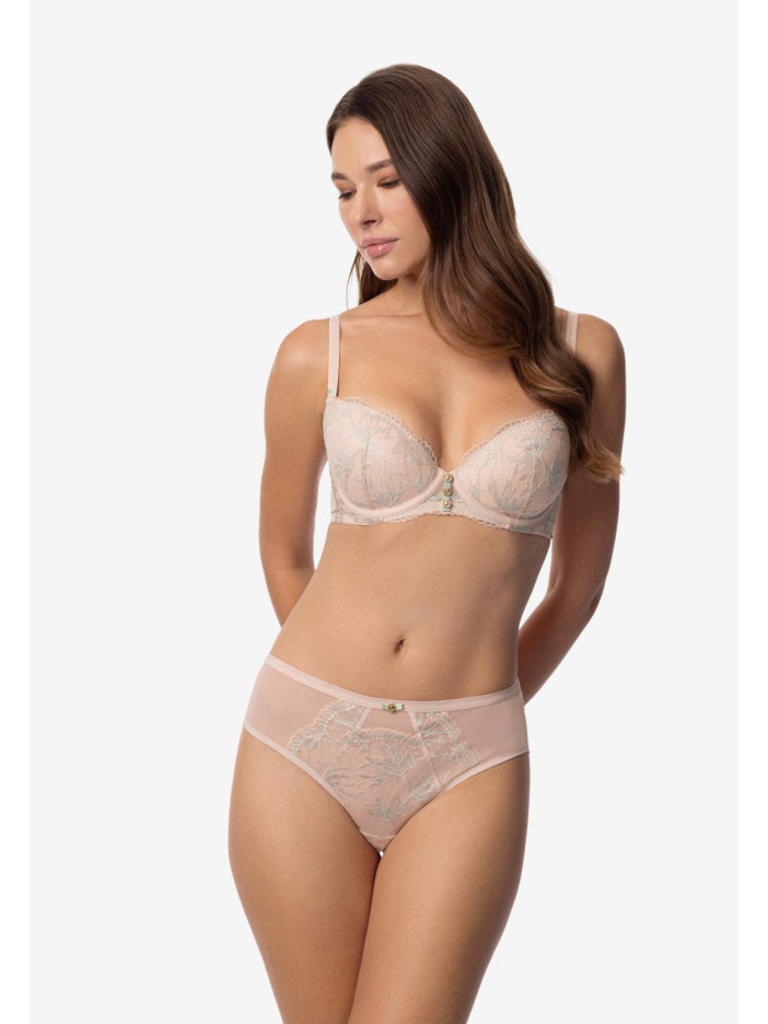 Серия ANTOINETTE – это элегантное кружево в мягких тонах, легкое и прозрачное на приятной основе. Нежно-розовый цвет с мятными акцентами придает свежести образу. ANTOINETTE сочетает легкость и выразительность, объединяя щекотливость и уверенность. Бюстгальтер на каркасной поддержке с формованной чашкой и съемными корректорами пуш-ап – идеальный баланс комфорта, поддержки и соблазнительного силуэта. Внутренняя сторона чашек дублирована мягким хлопком, который обеспечивает приятное чувство на коже и комфорт в течение всего дня. Состояние из эластичной сетки гармонично дополнено вставками из изысканного кружева, подчеркивающими женственность и легкость модели. Благодаря съемным корректорам можно регулировать степень объема и подстраивать бюстгальтер под любой образ.