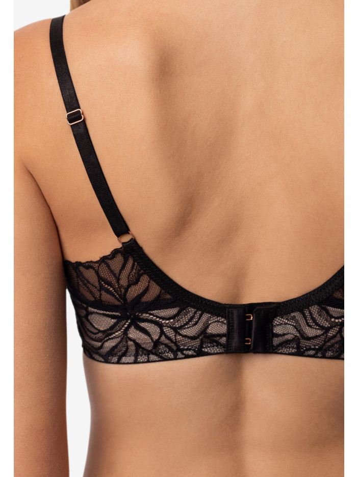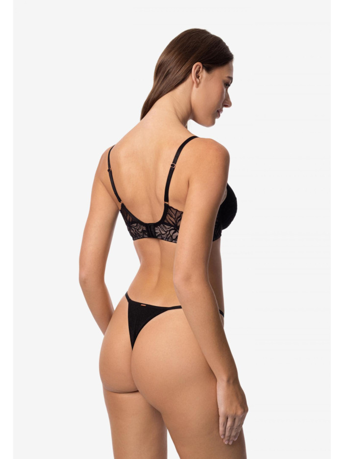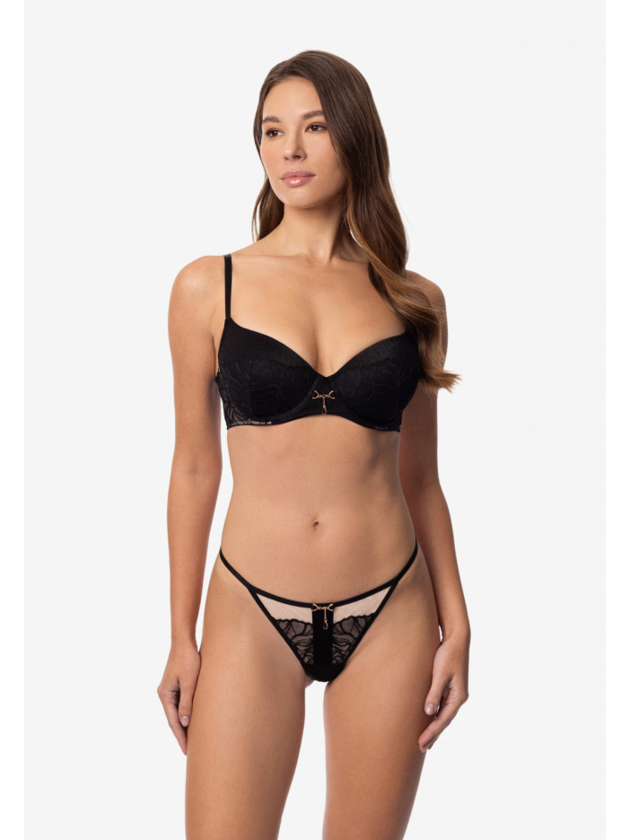 В серии LE MYSTÈRE мы объединили мягкость и силу, нежность и контраст. Черное кружево сочетается с сеткой, а графические канты из микрофибры придают четкости, сохраняя легкость и деликатность. LE MYSTÈRE – для тех, кто ценит баланс и смелость самовыражения. Бюстгальтер с формованными чашками и съемными пуш-ап корректорами создает идеальный объем и соблазнительную форму груди. Каркасная поддержка обеспечивает комфорт и уверенность в течение всего дня. Боковые панели украшены изысканным плетением сетки и кружева, придавая модели легкости и утонченности. Круглая спинка делает образ гармоничным и завершенным.