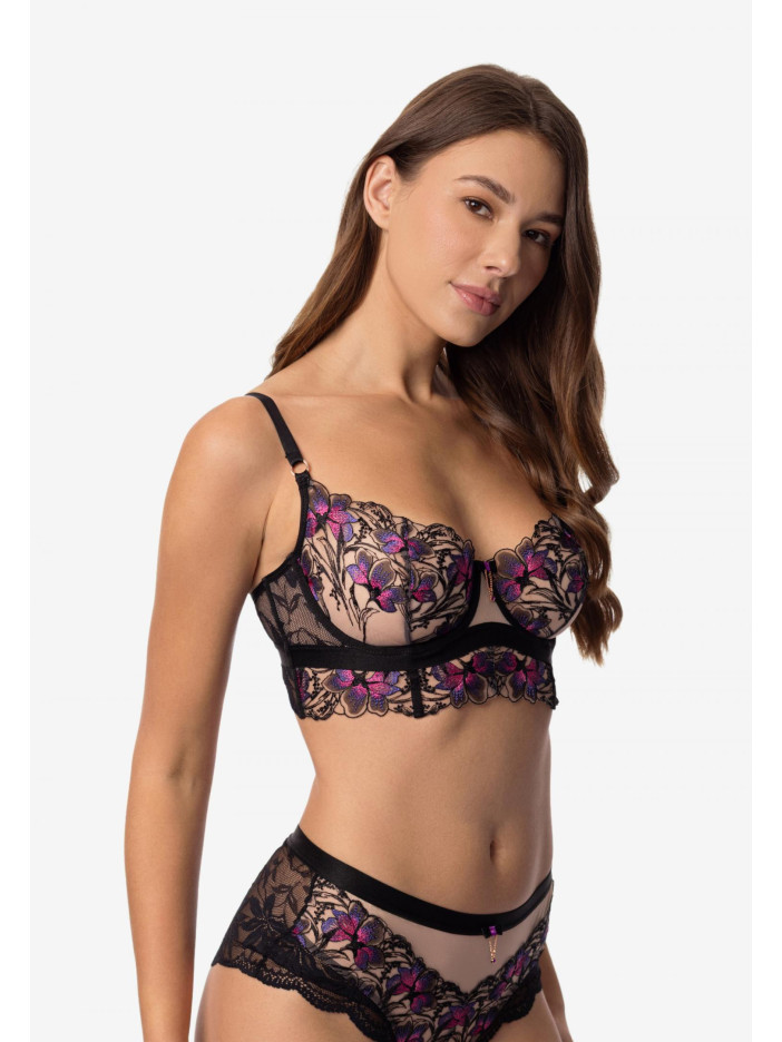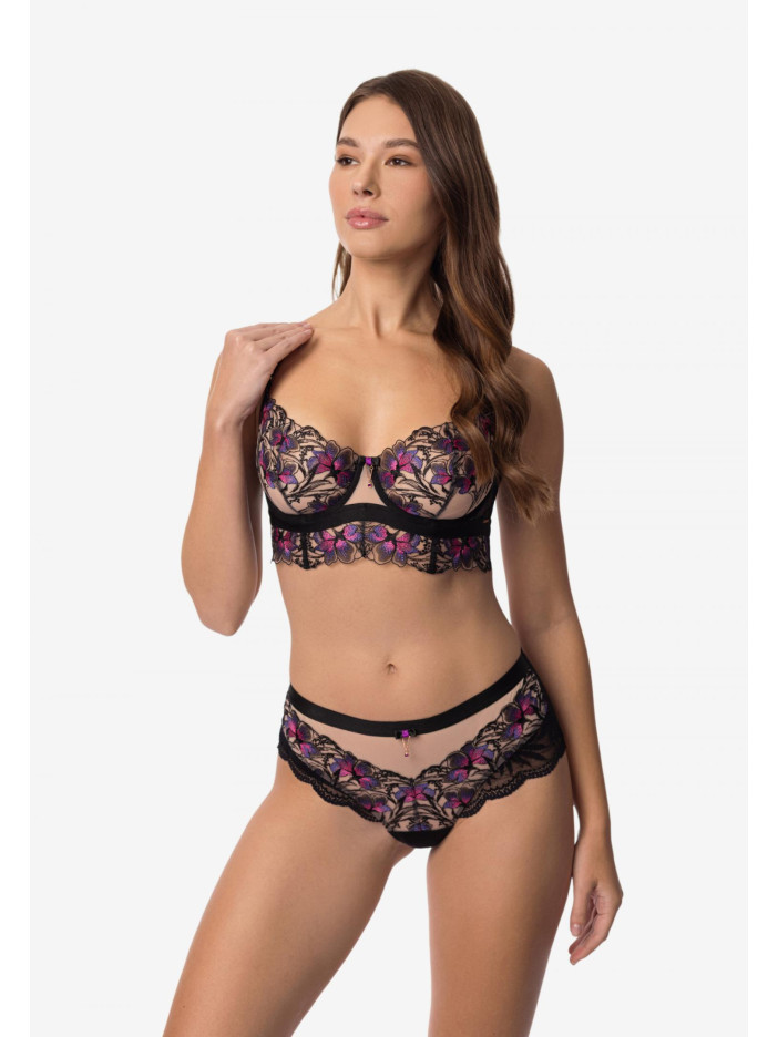 GLORIOUS — это смелое белье с нежной цветочной вышивкой и черным эластичным кружевом. Насыщенные оттенки на темном фоне создают поразительный контраст, словно цветущий сад в тишине ночи. Это белье — воплощение женственности и уверенности, отраженных в каждой изгибе и линии. Изысканный бюстгальтер с мягкими чашечками на косточках сочетает в себе комфорт и элегантность. Чашечки и передняя часть удлиненной талии украшены нежной вышивкой, создавая утонченный и женственный образ. Внутри чашечек имеется боковая сетчатая вставка для дополнительной поддержки и мягкой фиксации груди. Боковые элементы выполнены из кружевной ткани и дополнены косточками, обеспечивая аккуратную форму и надежную поддержку. Удлиненная спереди талия украшена вышивкой, подчеркивающей изящество и создающей идеальную посадку.