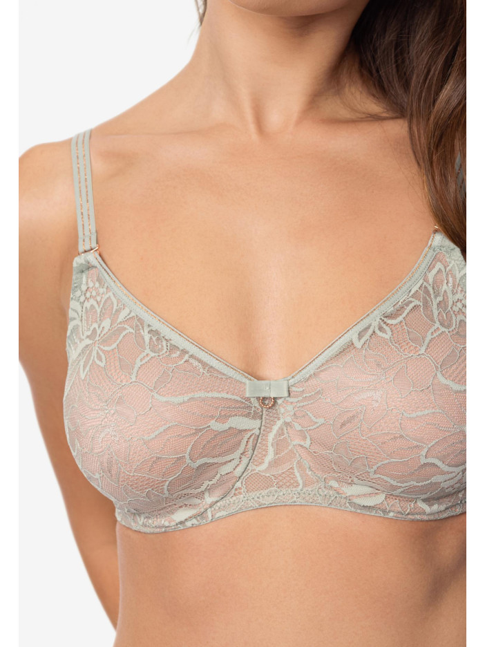 Серия DREAMER – праздник безупречного вкуса: роскошное кружево с благородной матовой текстурой, дополняют отделку узкой эластичной тесьмой с золотой нитью и миниатюрные аксессуары из розового золота. Красота, искусно доведенная до идеала. Бюстгальтер с мягкой молдированной чашкой на косточках. Внутри чашка дублирована микрофиброй. Бретели отстегиваются спереди. Верхний край чашек по линии декольте декорирован эластичной тесьмой с вплетением золотистой нити. Боковые детали из кружева на подложке для дополнительной поддержки. Круглая комфортная спинка. Широкий размерный ряд, бюстгальтер прекрасно подойдет обладательницам пышных форм.