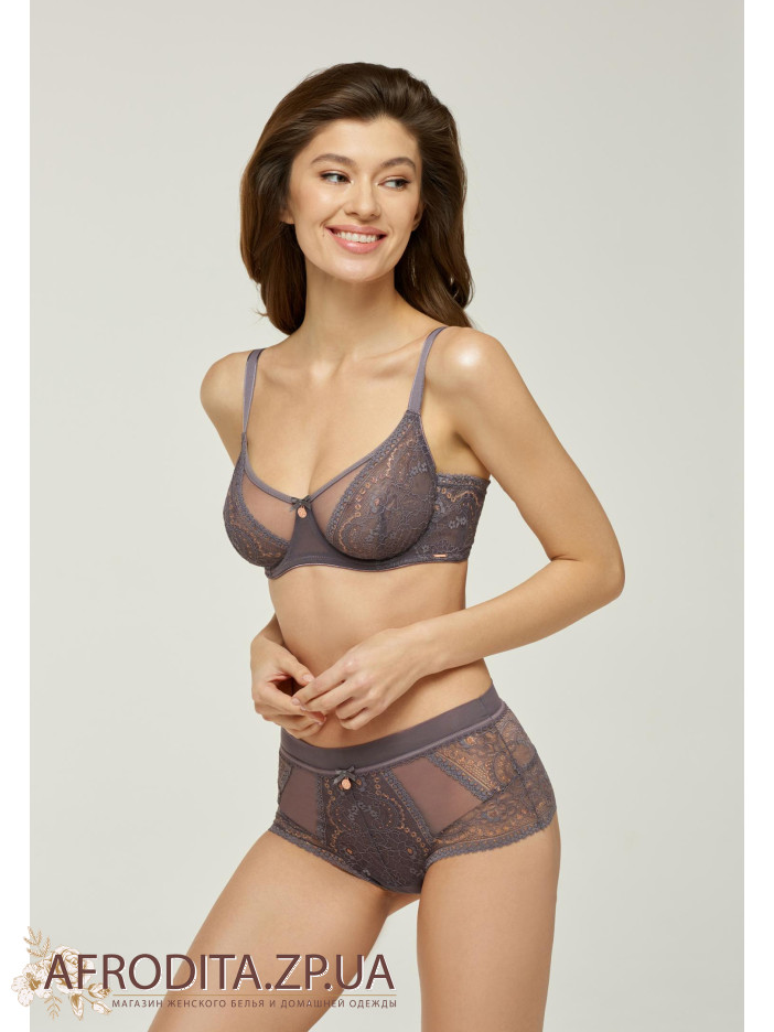 В комплекте трусы-брифы, линия талии завышена, пояс из двойной сетки ,передняя деталь из кружева на тонкой подкладке из сетки. На задней детали кружевные вставки с ажурными краями.
