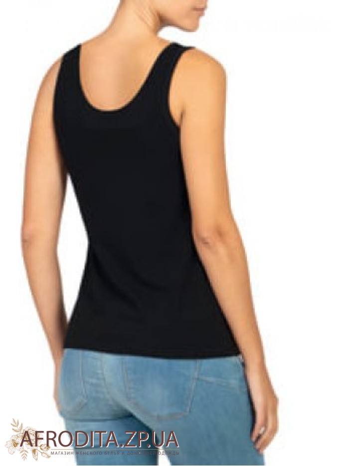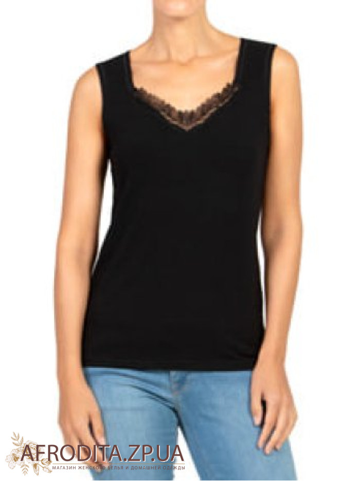 Майка на широких бретелях, имеет V-образный вырез, украшенный аппликацией из цветочного гипюра.