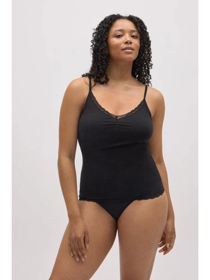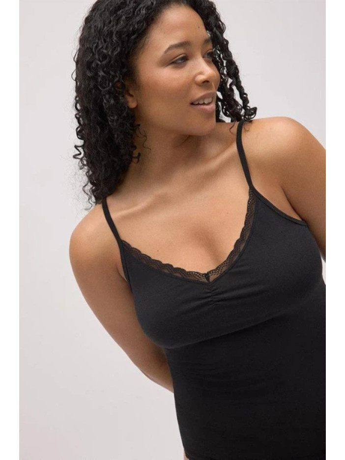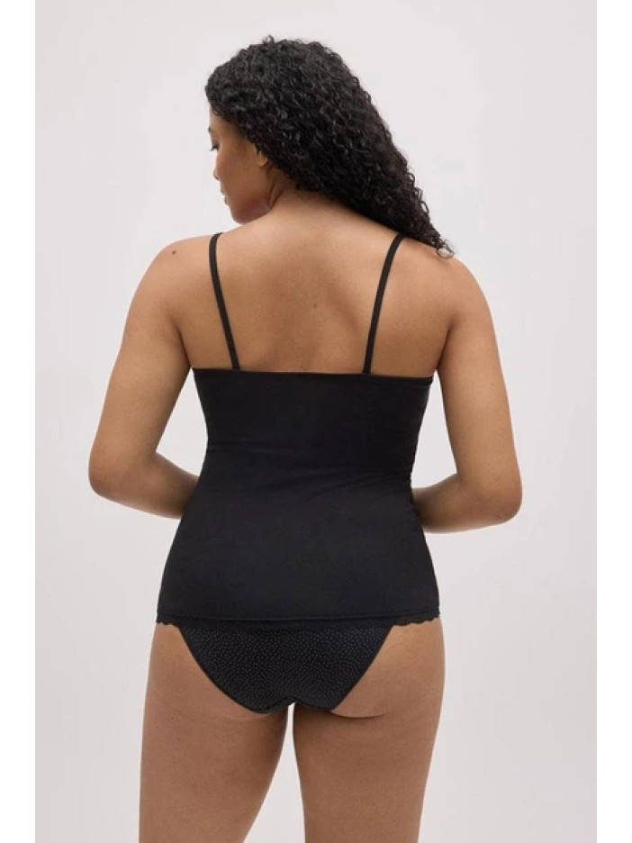 Чёрная хлопковая майка-камисоль от Ysabel Mora — лёгкий и универсальный базовый слой с тонкими бретелями и мягким эластичным трикотажем, который приятно прилегает к телу и обеспечивает комфорт в течение всего дня. V-образный вырез спереди украшен изящной узкой кружевной отделкой и аккуратными сборками по центру, формируя деликатный женственный силуэт. Идеально подходит как самостоятельный элемент гардероба или как аккуратная основа под рубашки, кардиганы и жакеты.