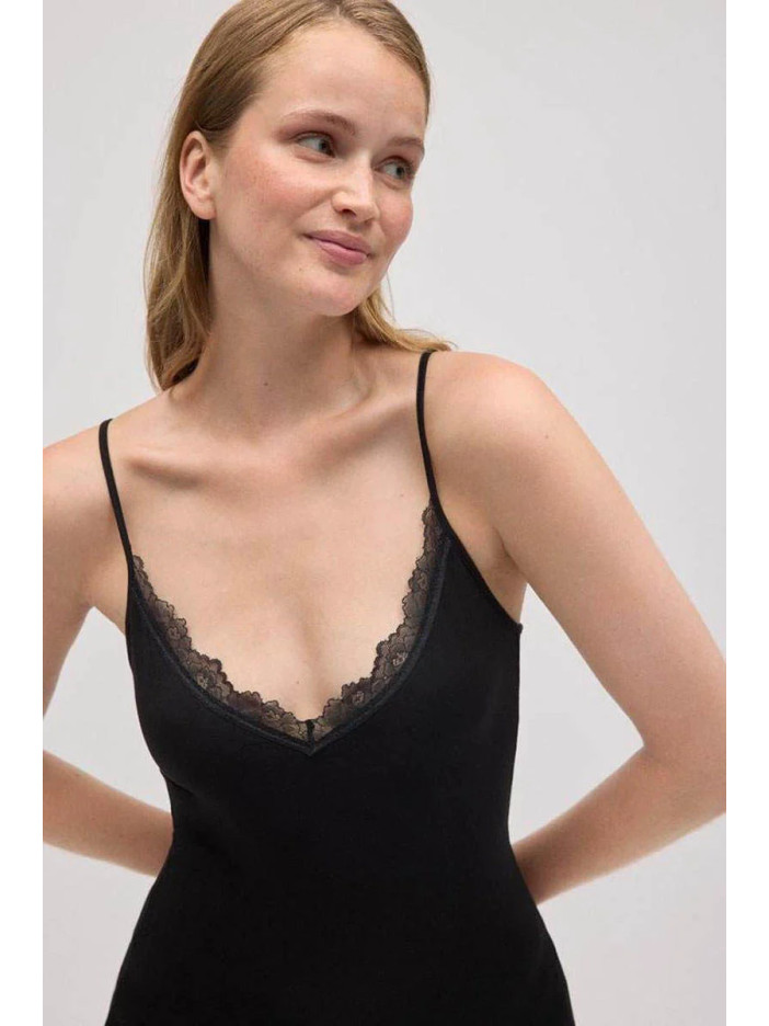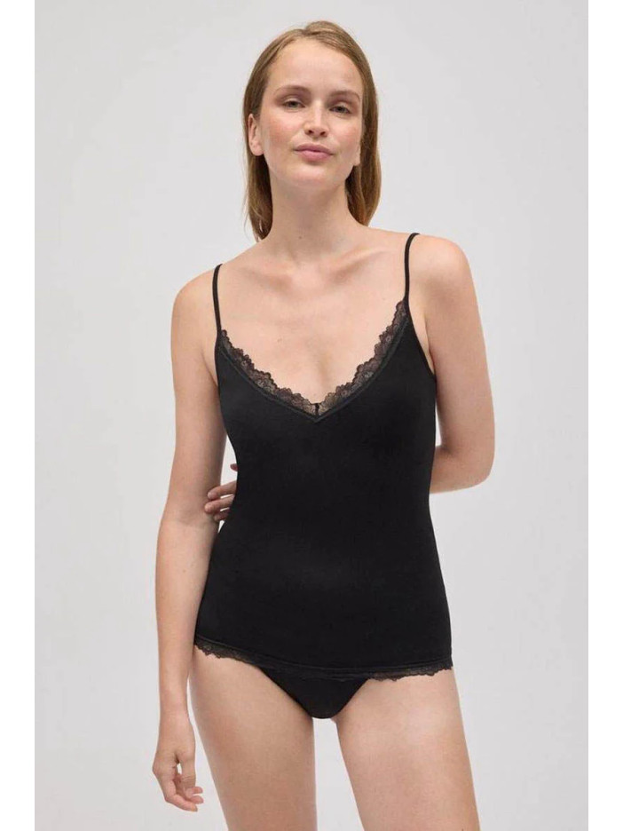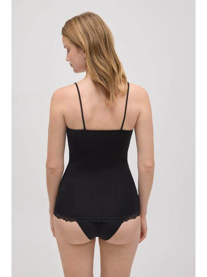 Женская черная майка от Ysabel Mora с тонкими бретелями выполнен из мягкого бамбукового трикотажа и украшен изящной кружевной отделкой. Прилегающий силуэт нежно облегает фигуру, словно вторая кожа, обеспечивая комфорт при носке под одеждой или как самостоятельный стильный элемент образа..