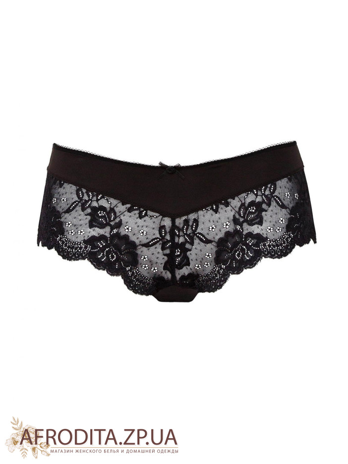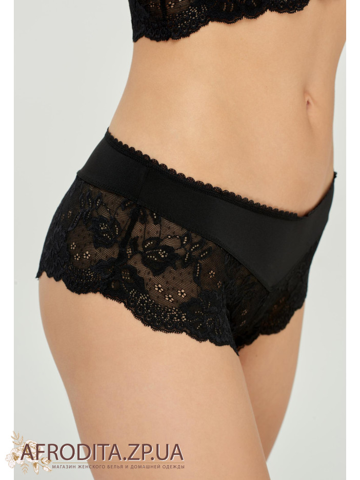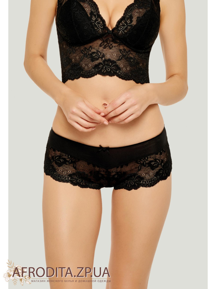Шорты с заниженной линией талии. Симметричные вставки из кружева. На передней и задней деталях – швы по центру. Ажурные края.