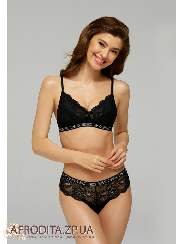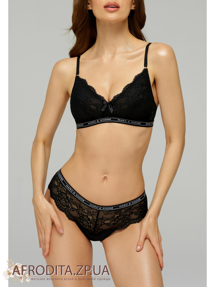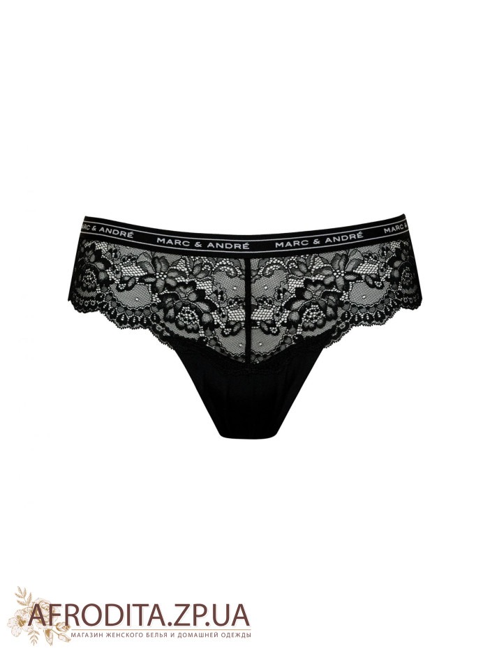 Трусики-стринги со средней линией талии. Передняя и задняя деталь из кружевного полотна с ажурными краями, без бокового шва. Верхний край выполнен из эластичной тесьмы с надписью Marc&Andre.