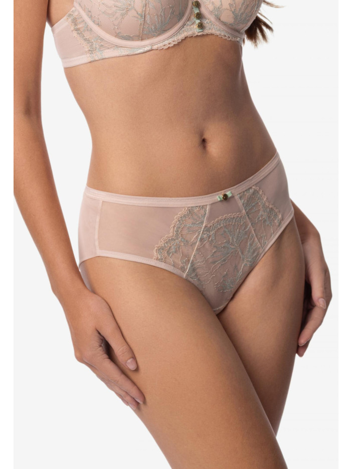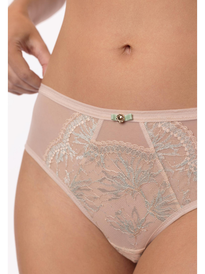 Серия ANTOINETTE – это элегантное кружево в мягких тонах, легкое и прозрачное на приятной основе. Нежно-розовый цвет с мятными акцентами придает свежести образу. ANTOINETTE сочетает легкость и выразительность, объединяя щекотливость и уверенность. Изящные трусы-бразилиана средней посадки подчеркивают женственность и легкость. Передняя деталь из кружева на тонкой сетчатой подложке создает изысканный рельеф, а задняя часть из двойной сетки в подворот с кружевной вставкой придает чувственность и безупречность линий.