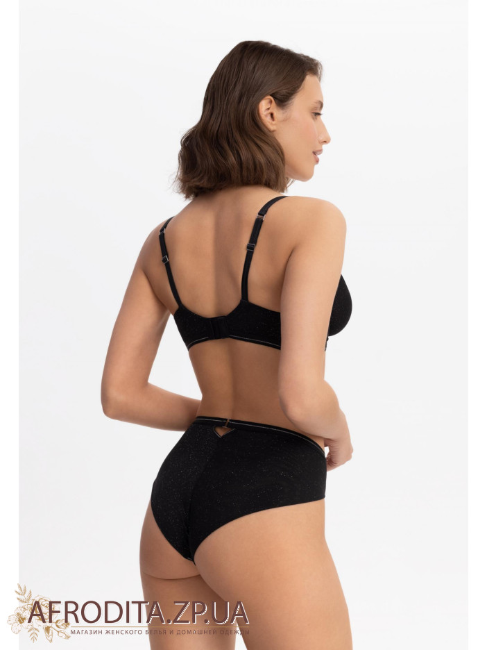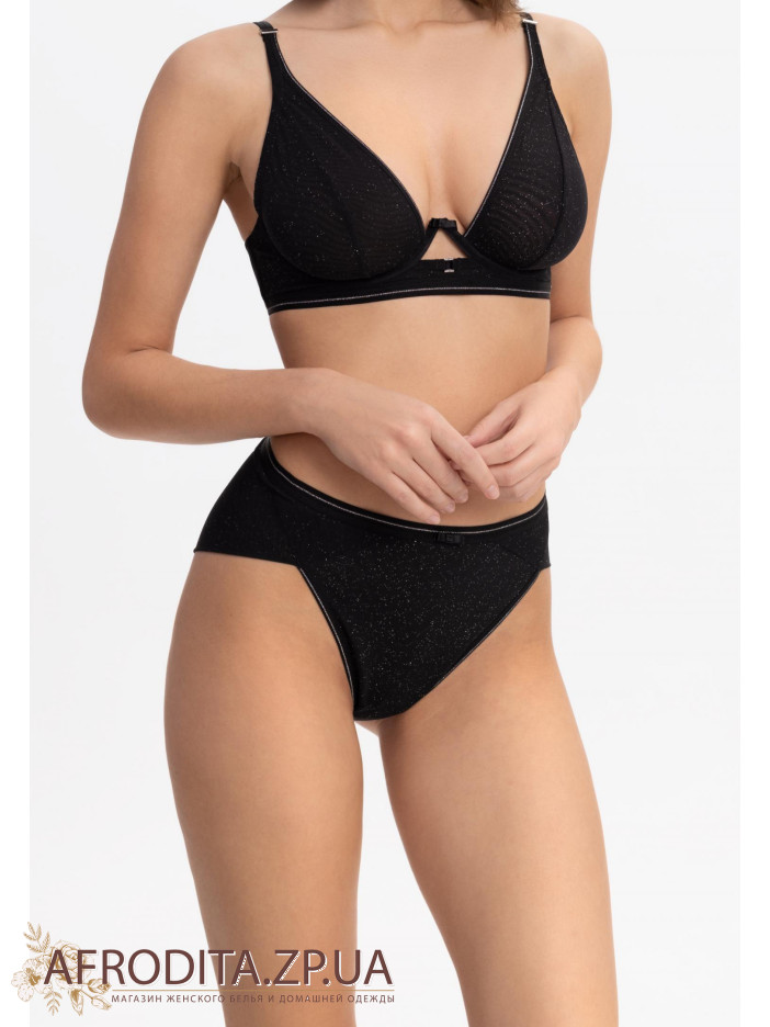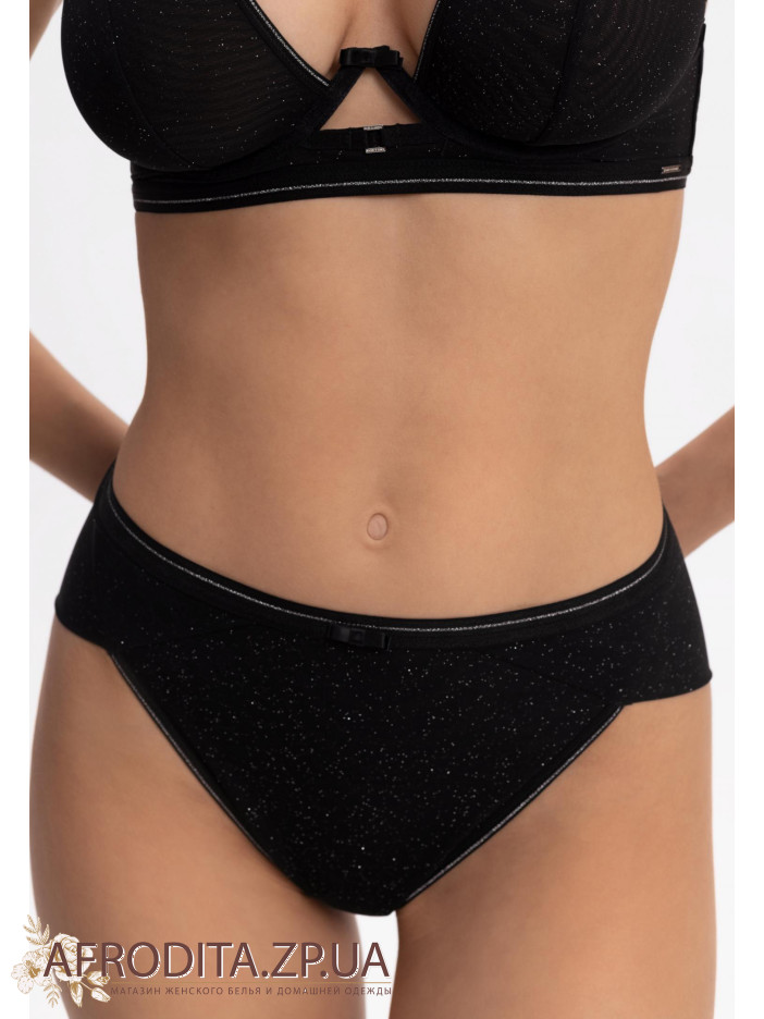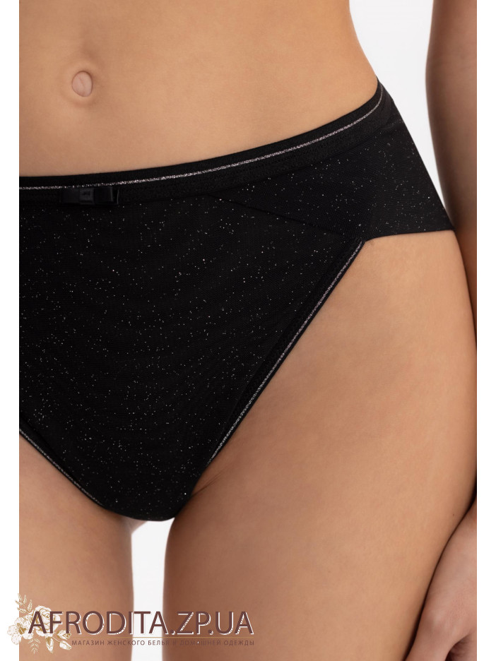 Трусы-бразилиана с высокой посадкой. Передняя деталь из эластичной сетки с микроблестками на подложке. Задняя деталь: двойная сетка с микроблестками в подворотне. Пояс с серебряной нитью обрамляет талию, подчеркивая ее изгиб. Серия DEEP NIGHT – пусть звезды говорят за вас!
