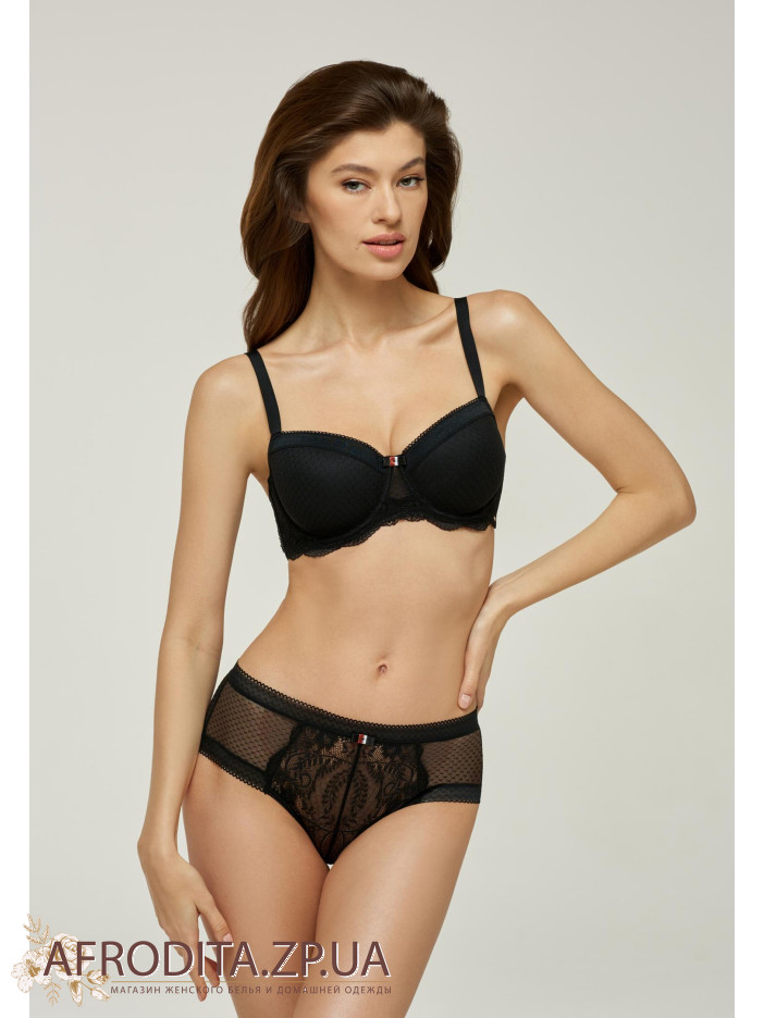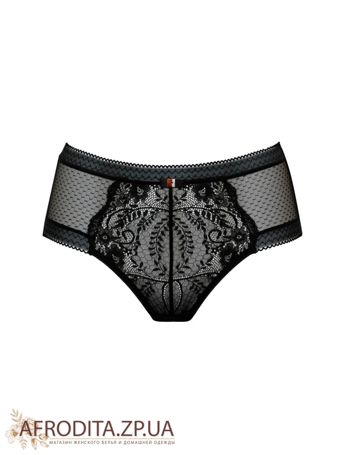 Брифы с повышенной линией талии. По верхнему краю идет мягкая эластичная лента. По бокам имеются симметричные фигурные вставки из эластичного кружевного полотна и сетки. Задняя деталь: сетка и кружево. Декор – сатиновый бантик.